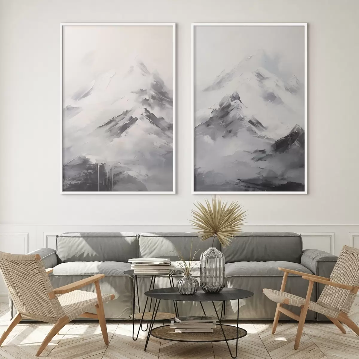 Poster Havas hegycsúcsok szürke árnyékokkal, szürke ég, ecsetvonások, texturált, minimalista Nr d00822