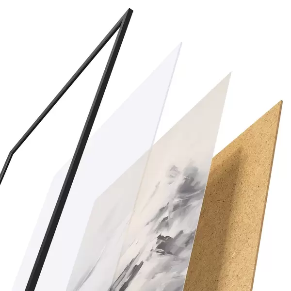 A poszter keretből, plexiből, nyomtatott képből és forgácslap hátlapból áll. A poszter a hátoldalon található rögzítőknek köszönhetően azonnal felakasztható a falra.