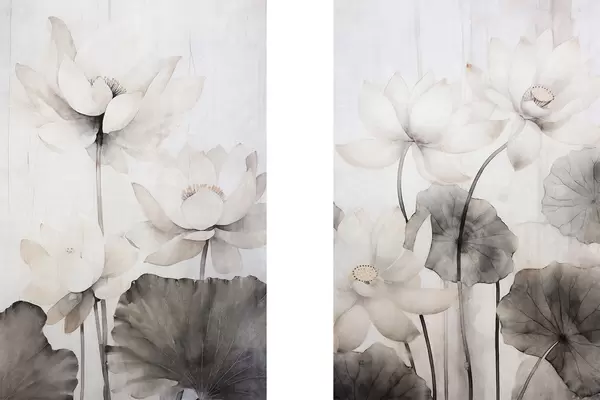 Poster Fehér textúrájú lótuszvirágok sötét levelekkel, világos háttérrel, minimalista dizájn Nr d00824