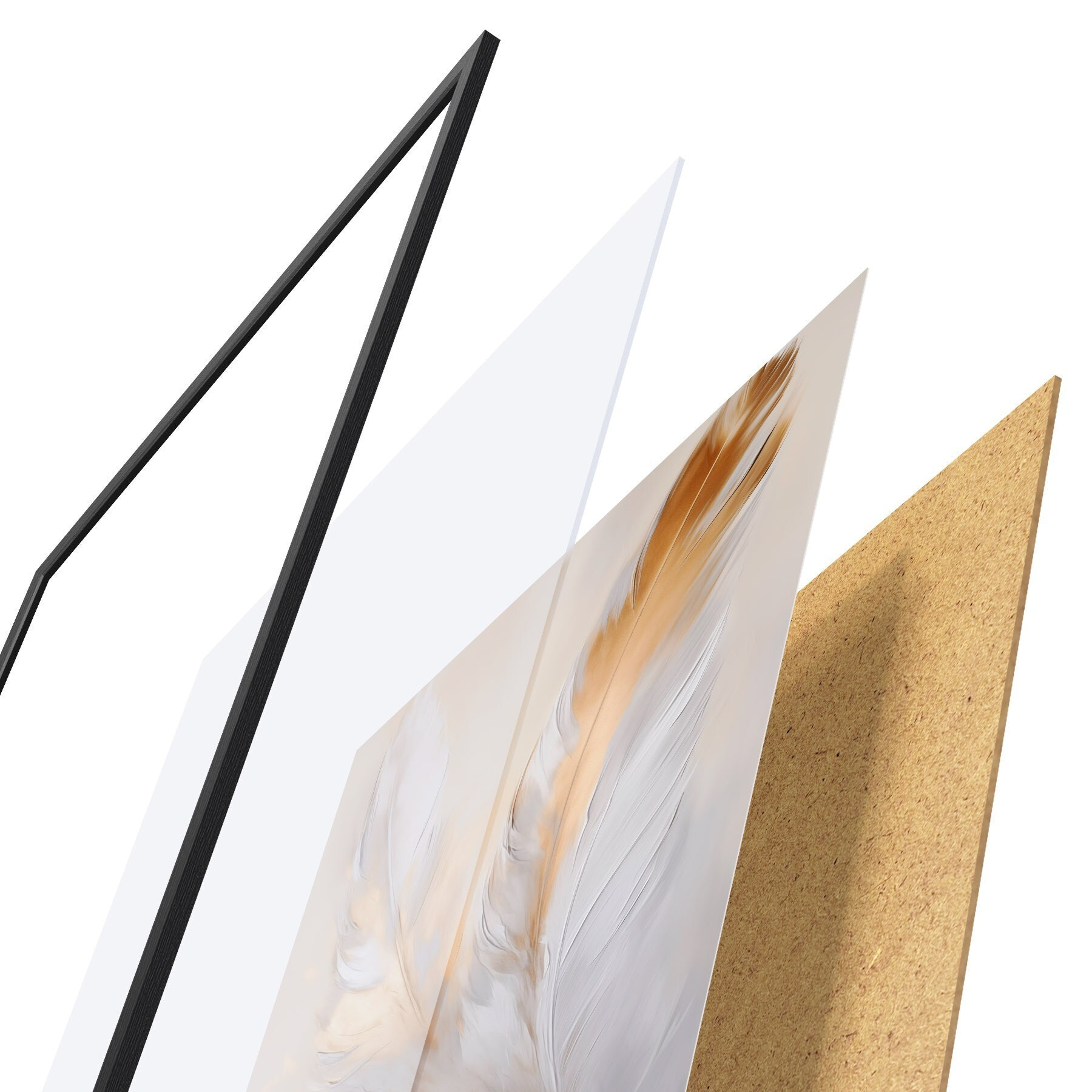 A poszter keretből, plexiből, nyomtatott képből és forgácslap hátlapból áll. A poszter a hátoldalon található rögzítőknek köszönhetően azonnal felakasztható a falra.