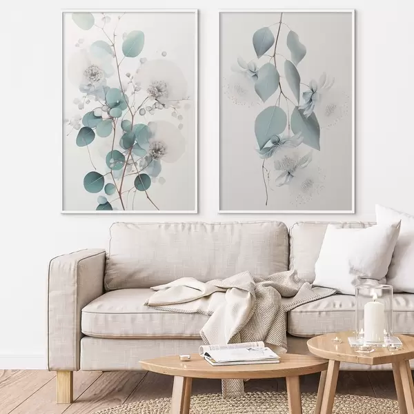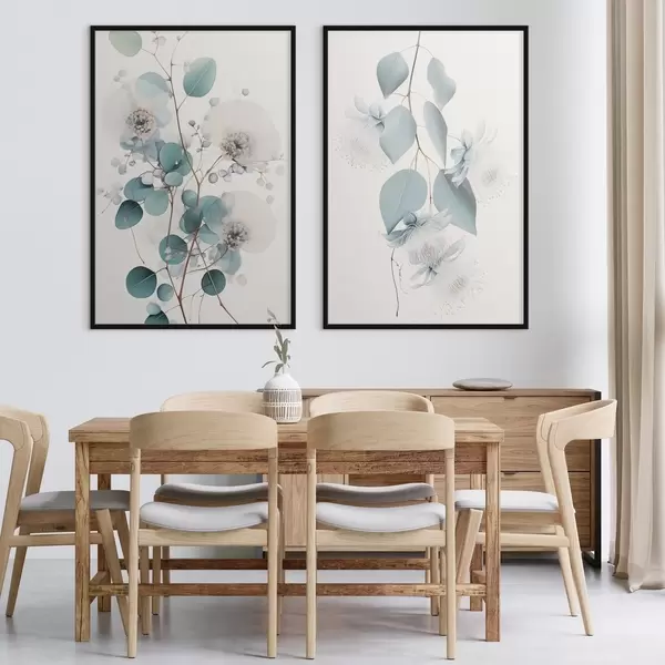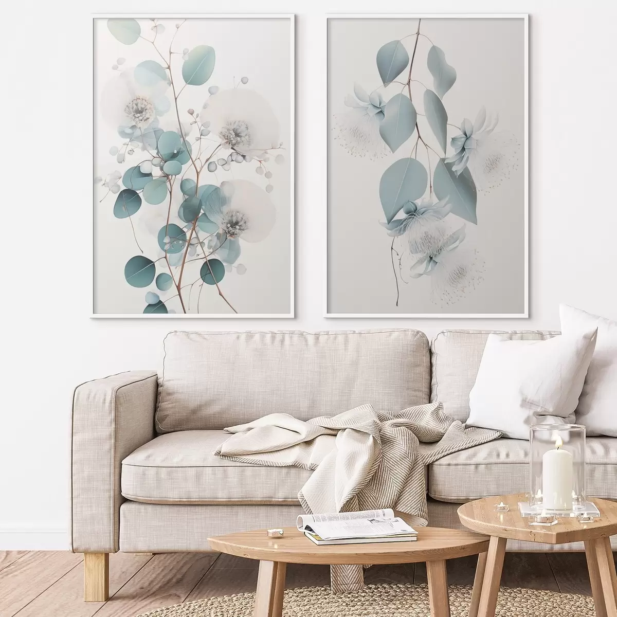 Poster Eukaliptusz ág kék levelekkel és fehér virágokkal, világos háttérrel Nr d00829