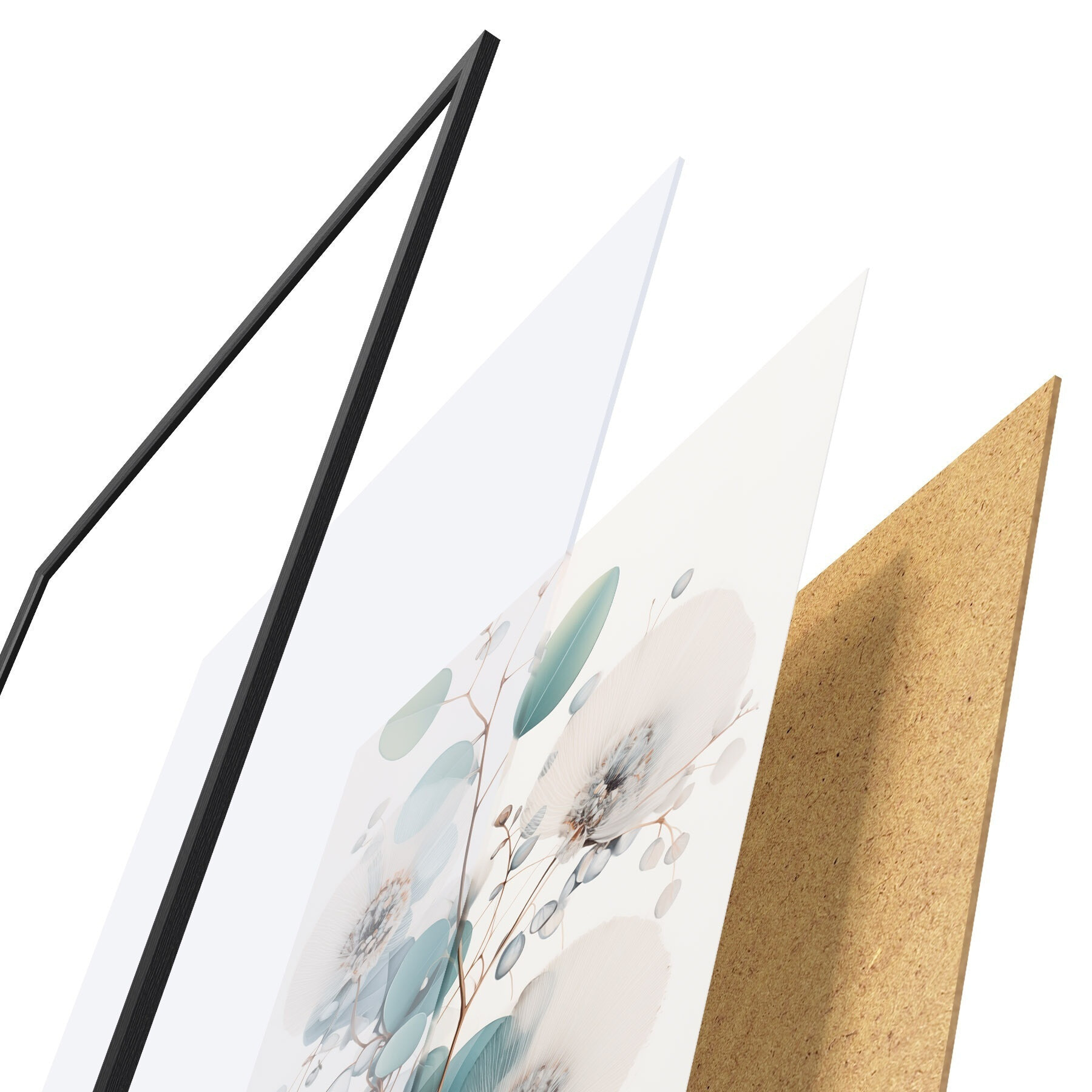 A poszter keretből, plexiből, nyomtatott képből és forgácslap hátlapból áll. A poszter a hátoldalon található rögzítőknek köszönhetően azonnal felakasztható a falra.