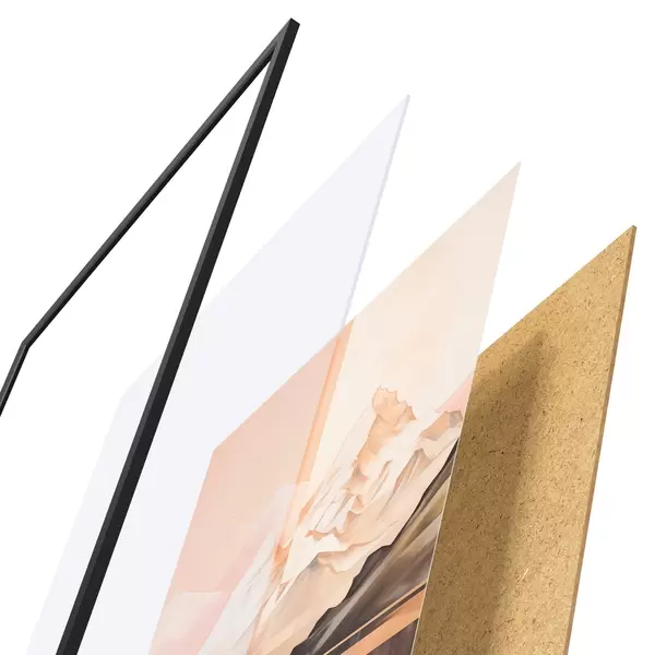 A poszter keretből, plexiből, nyomtatott képből és forgácslap hátlapból áll. A poszter a hátoldalon található rögzítőknek köszönhetően azonnal felakasztható a falra.