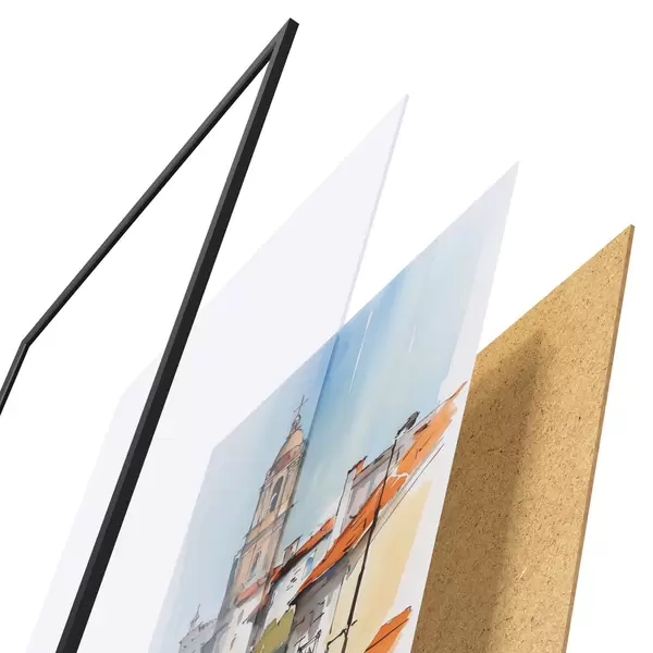 A poszter keretből, plexiből, nyomtatott képből és forgácslap hátlapból áll. A poszter a hátoldalon található rögzítőknek köszönhetően azonnal felakasztható a falra.