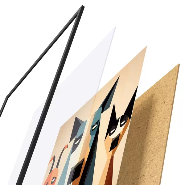 A poszter keretből, plexiből, nyomtatott képből és forgácslap hátlapból áll. A poszter a hátoldalon található rögzítőknek köszönhetően azonnal felakasztható a falra.