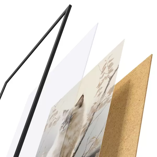 A poszter keretből, plexiből, nyomtatott képből és forgácslap hátlapból áll. A poszter a hátoldalon található rögzítőknek köszönhetően azonnal felakasztható a falra.