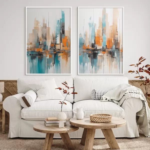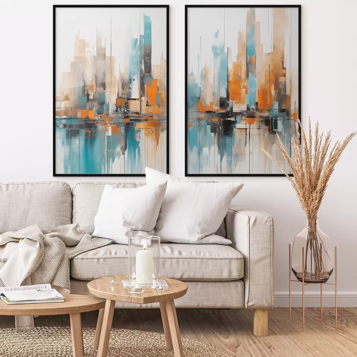 Plakát a sziklán Absztrakt városi tájkép függőleges ecsetvonásokkal narancssárga, kék és fehér árnyalatokban, festészeti stílusban d00876