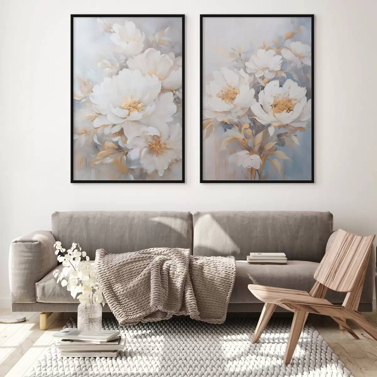 Poster Fehér pünkösdi rózsák sárga közepekkel és levelekkel, lágy ecsetvonások, világoskék háttér, virágkompozíció Nr d00878