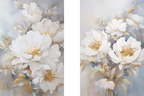 Poster Fehér pünkösdi rózsák sárga közepekkel és levelekkel, lágy ecsetvonások, világoskék háttér, virágkompozíció Nr d00878