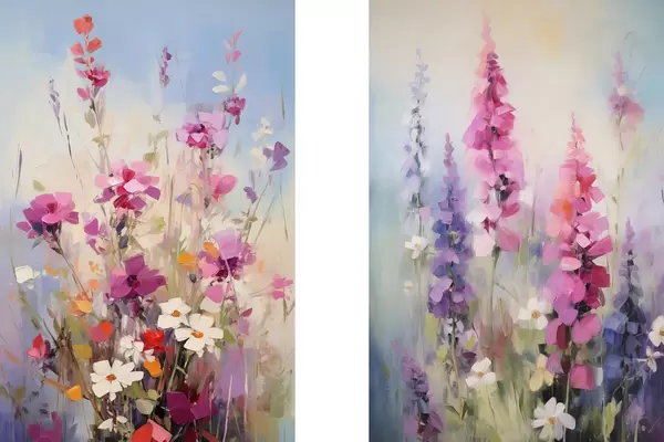 Plakát a sziklán Élénk virágok fehér margarétákkal egy mezőn, lágy ecsetvonások, pasztell színek, impresszionista stílus d00882