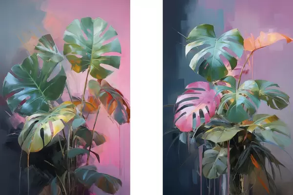 Poster Absztrakt monstera növény élénkzöld levelekkel, lágy rózsaszín és lila árnyalatok háttérében Nr d00886