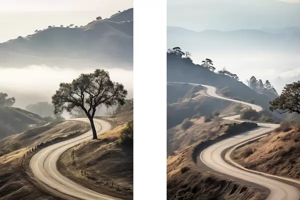 Poster Kanyargós út dombos tájban, száraz fűvel, tiszta égbolttal és a távolban látható hegyekkel. Nr d00887