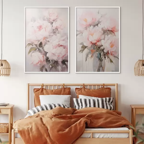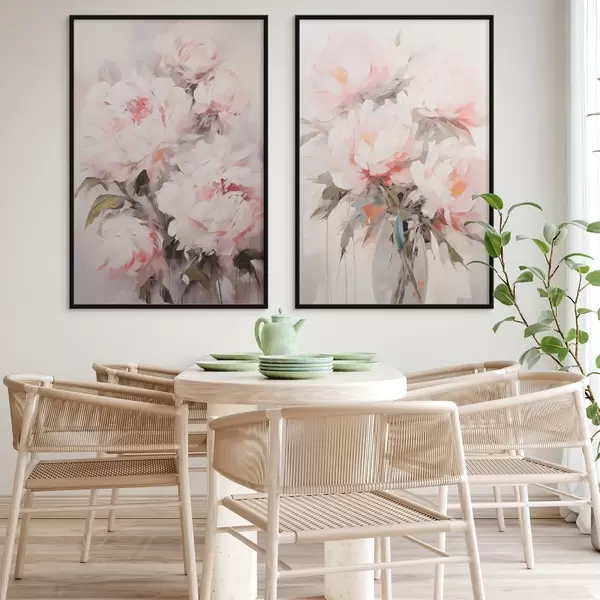 Poster Világos rózsaszín pünkösdi rózsák csokor zöld levelekkel, lágy ecsetvonásokkal, pasztell színekkel, világos háttérrel Nr d00890