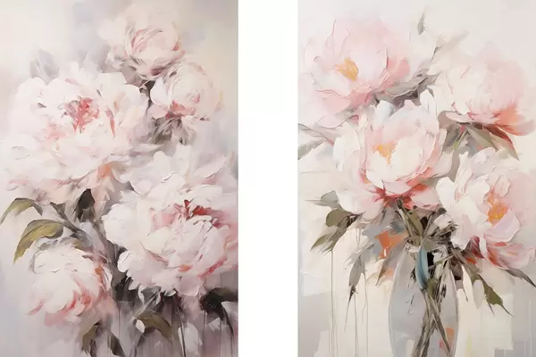 Poster Világos rózsaszín pünkösdi rózsák csokor zöld levelekkel, lágy ecsetvonásokkal, pasztell színekkel, világos háttérrel Nr d00890