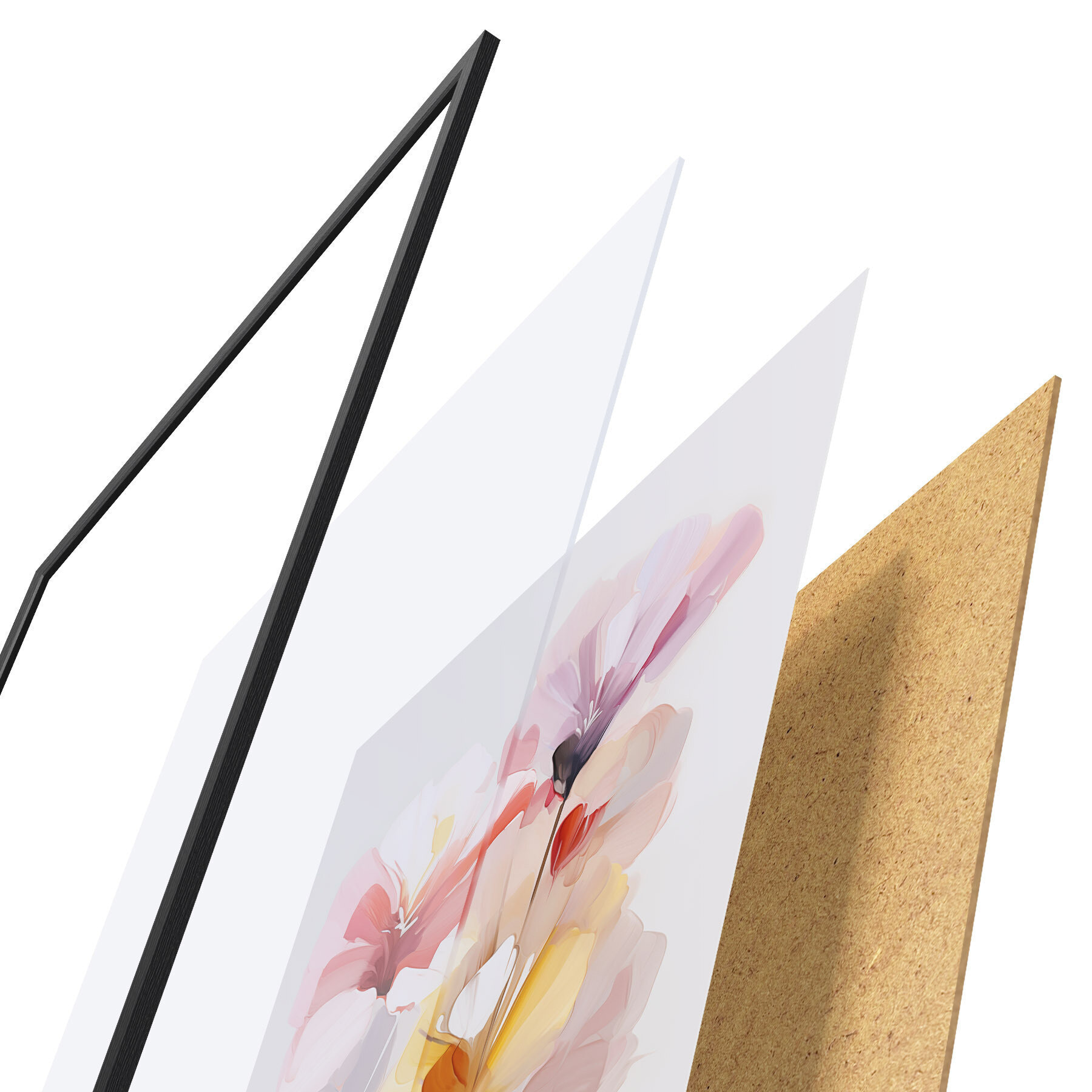 A poszter keretből, plexiből, nyomtatott képből és forgácslap hátlapból áll. A poszter a hátoldalon található rögzítőknek köszönhetően azonnal felakasztható a falra.