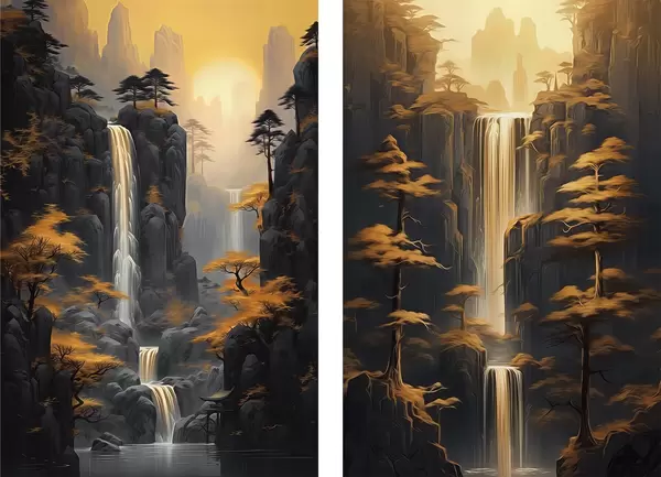 Poster Táj vízeséssel és hegyekkel aranyfényben Nr d00928