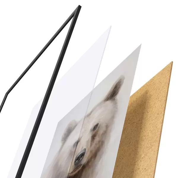 A poszter keretből, plexiből, nyomtatott képből és forgácslap hátlapból áll. A poszter a hátoldalon található rögzítőknek köszönhetően azonnal felakasztható a falra.
