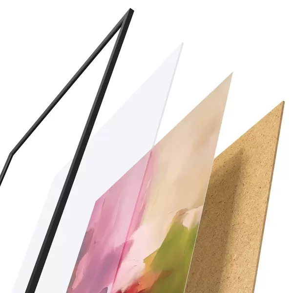 A poszter keretből, plexiből, nyomtatott képből és forgácslap hátlapból áll. A poszter a hátoldalon található rögzítőknek köszönhetően azonnal felakasztható a falra.