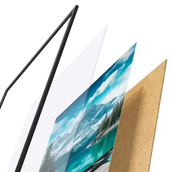 A poszter keretből, plexiből, nyomtatott képből és forgácslap hátlapból áll. A poszter a hátoldalon található rögzítőknek köszönhetően azonnal felakasztható a falra.