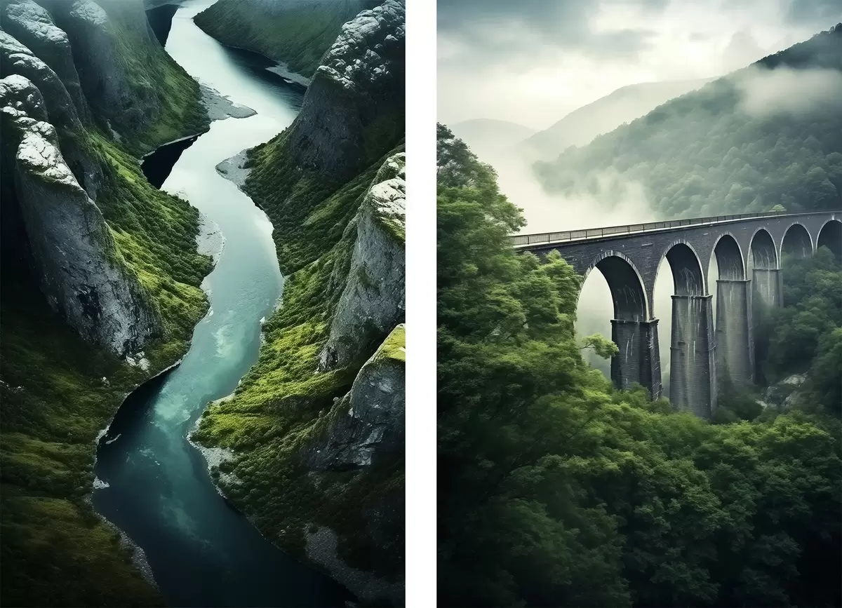Poster Légi folyó kanyon és ködös viadukt a zöld dombok között Nr d00967