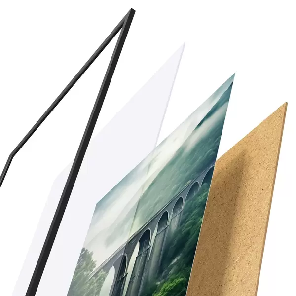 A poszter keretből, plexiből, nyomtatott képből és forgácslap hátlapból áll. A poszter a hátoldalon található rögzítőknek köszönhetően azonnal felakasztható a falra.