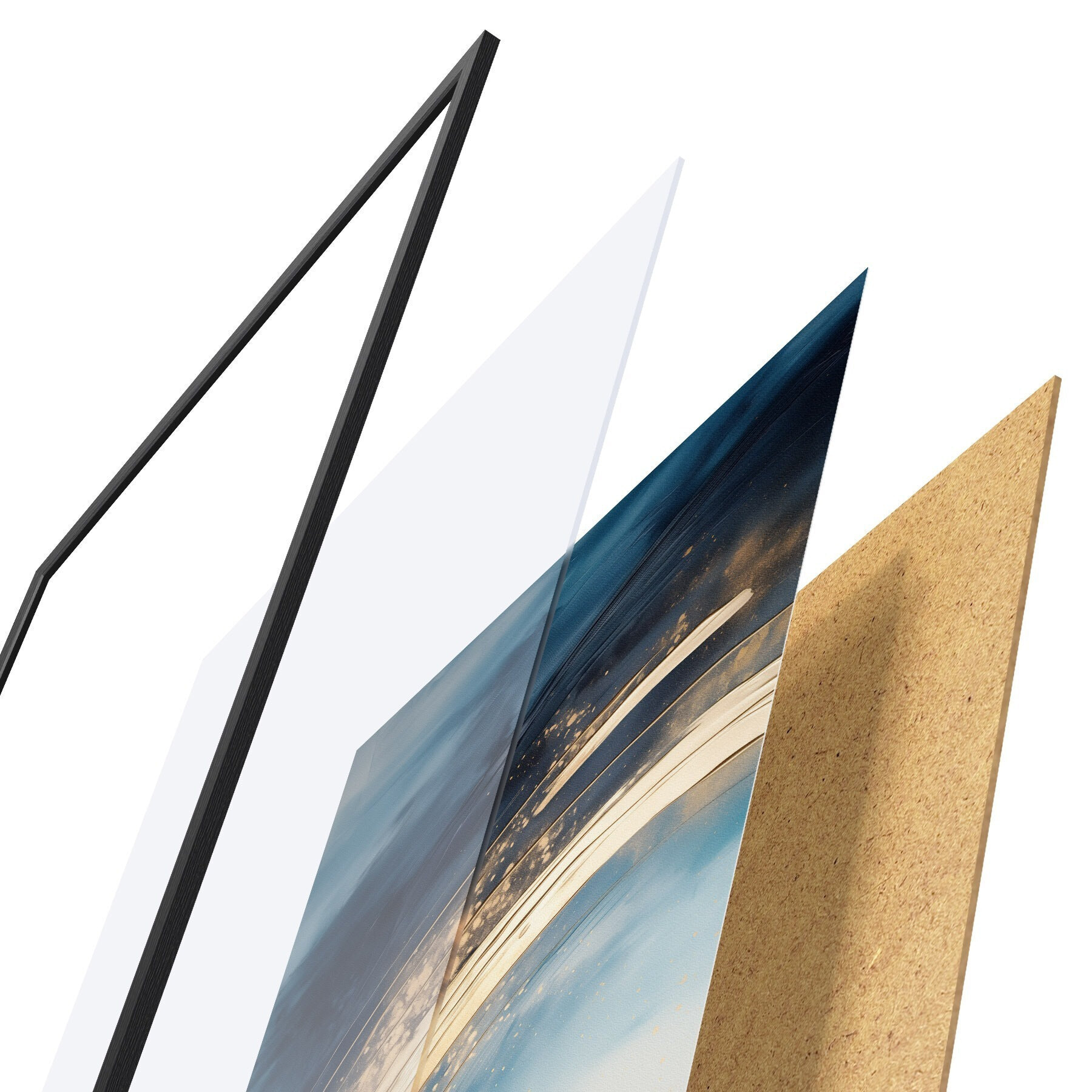 A poszter keretből, plexiből, nyomtatott képből és forgácslap hátlapból áll. A poszter a hátoldalon található rögzítőknek köszönhetően azonnal felakasztható a falra.