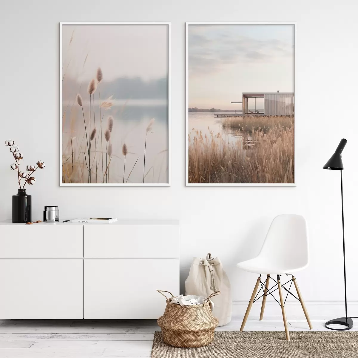 Poster Lágy nádasok egy csendes tó partján és modern kunyhó a parton Nr d00970