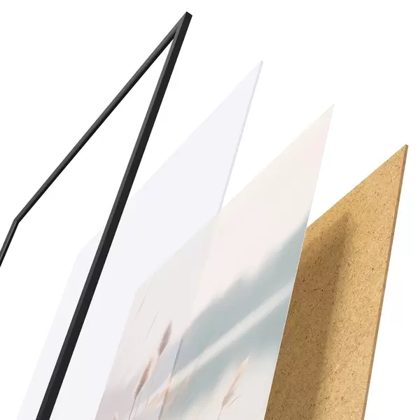 A poszter keretből, plexiből, nyomtatott képből és forgácslap hátlapból áll. A poszter a hátoldalon található rögzítőknek köszönhetően azonnal felakasztható a falra.