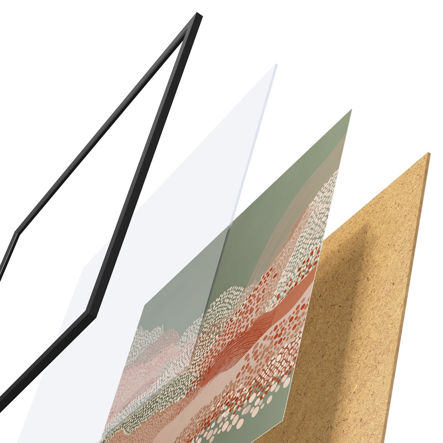 A poszter keretből, plexiből, nyomtatott képből és forgácslap hátlapból áll. A poszter a hátoldalon található rögzítőknek köszönhetően azonnal felakasztható a falra.
