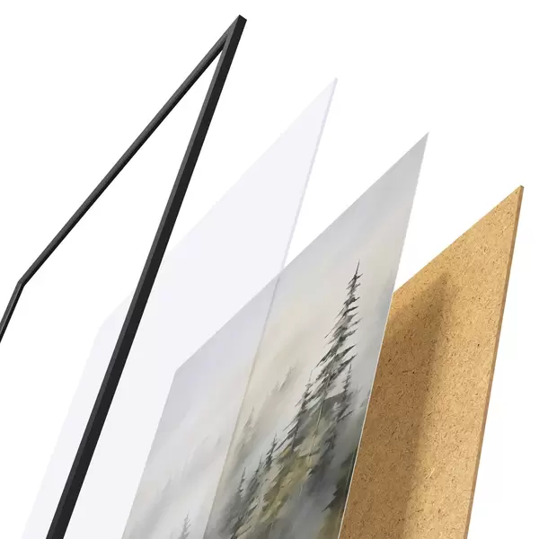 A poszter keretből, plexiből, nyomtatott képből és forgácslap hátlapból áll. A poszter a hátoldalon található rögzítőknek köszönhetően azonnal felakasztható a falra.