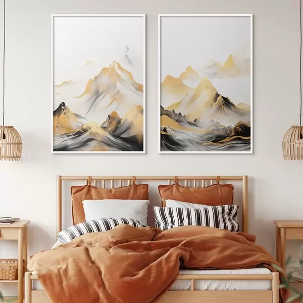 Poster Texturált sárga és fekete hegyek havas csúcsokkal, tusfestés stílusban, minimalista hegylánc Nr d01002