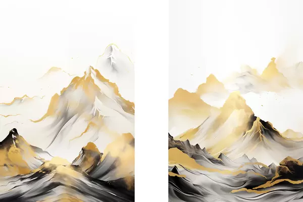 Poster Texturált sárga és fekete hegyek havas csúcsokkal, tusfestés stílusban, minimalista hegylánc Nr d01002
