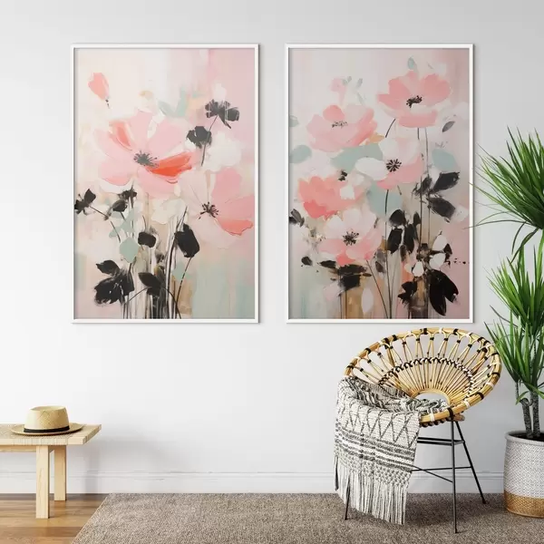 Plakát a sziklán Rózsaszín és fekete virágok levelekkel, lágy pasztell színek, absztrakt virágkompozíció, minimalista művészet d01004