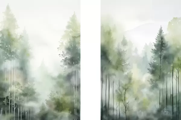 Poster Akvarellfestmény, amely magas fákkal és zöld lombokkal borított absztrakt erdőt ábrázol, lágy, tompított színekkel. Nr d01005