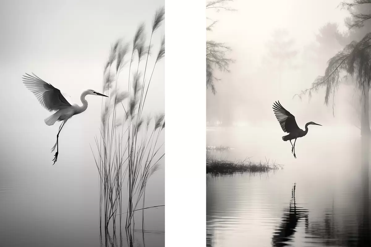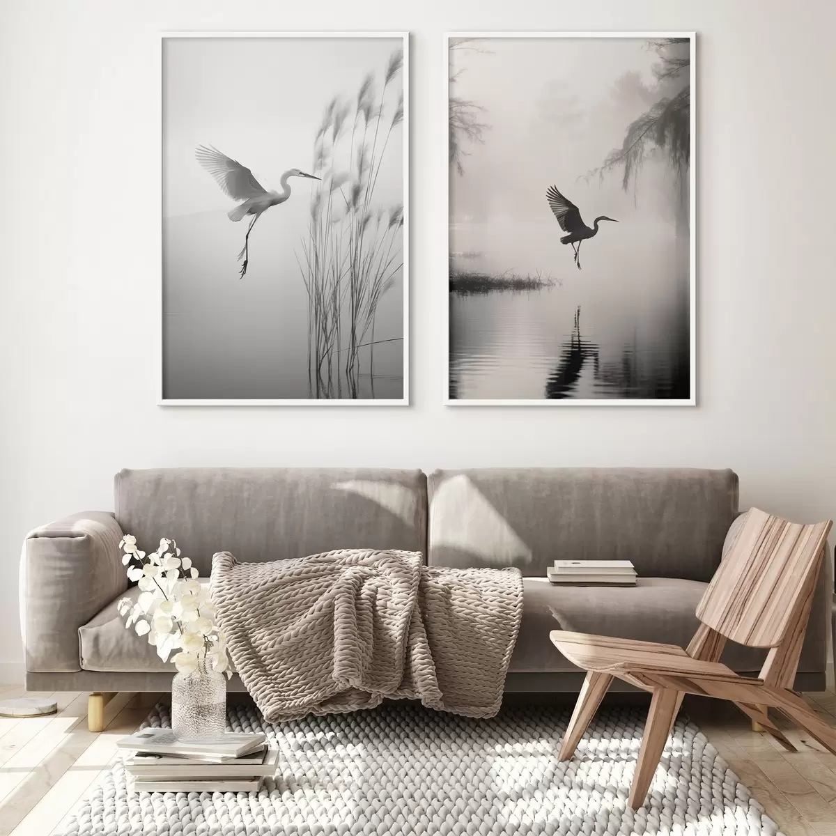 Poster Fehér gém, kiterjesztett szárnyakkal, magas nádas közelében repül, fekete-fehér minimalista kompozíció Nr d01007