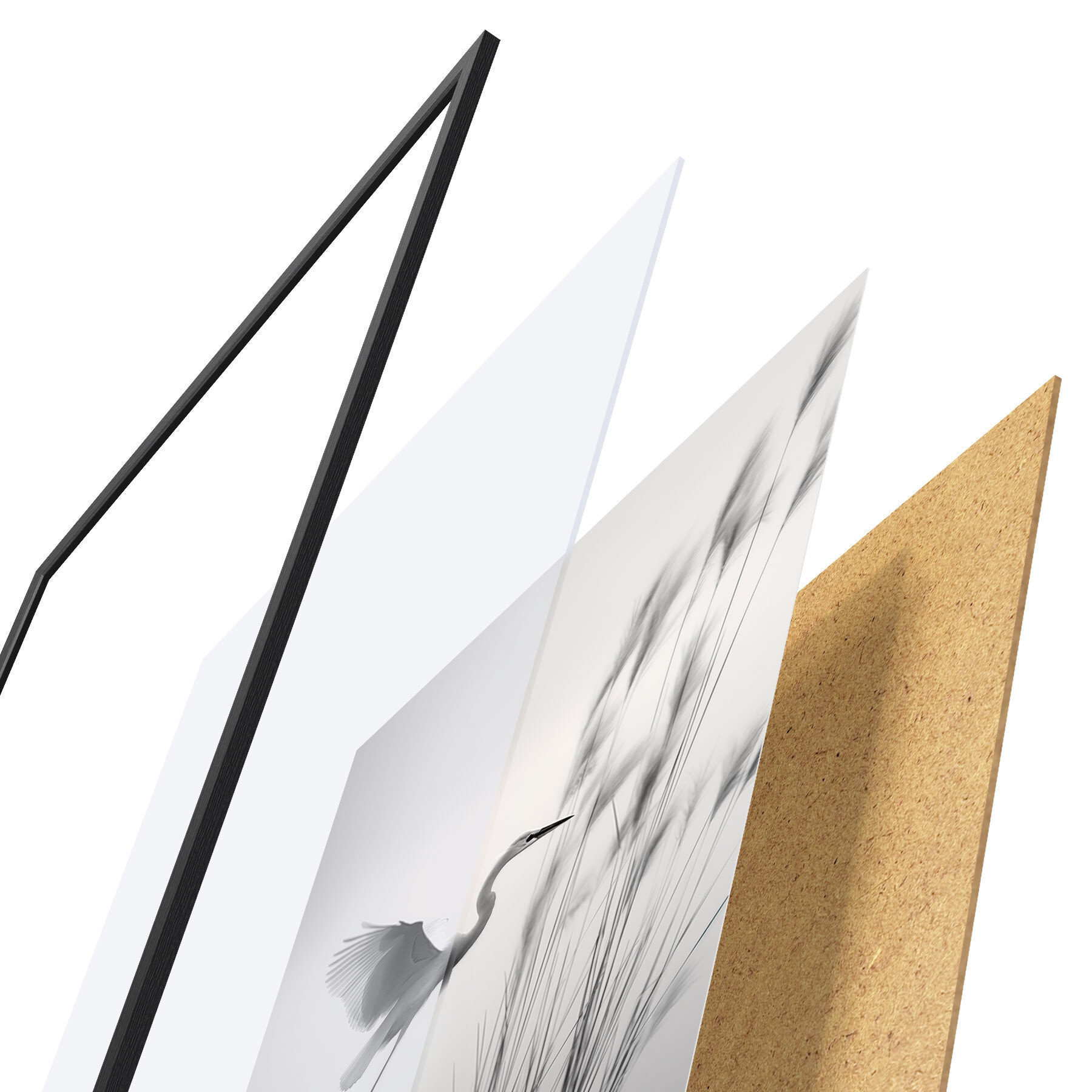 A poszter keretből, plexiből, nyomtatott képből és forgácslap hátlapból áll. A poszter a hátoldalon található rögzítőknek köszönhetően azonnal felakasztható a falra.