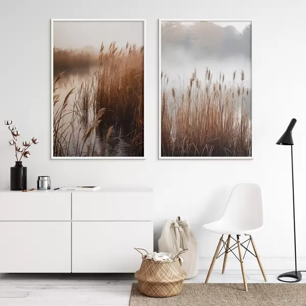 Poster Magas nádasok nőnek egy víztestben, a víz tükrözi a nádasokat, ködös háttér, lágy fény, természeti táj Nr d01008