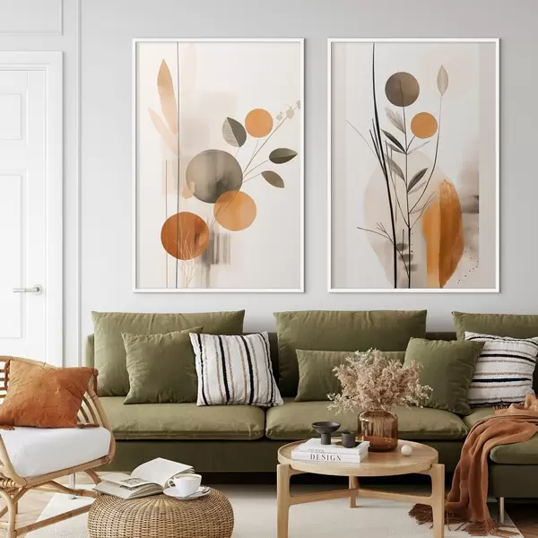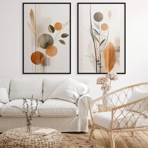 Plakát a sziklán Absztrakt festmény utánzat narancssárga és szürke körökkel, levelekkel és ágakkal, modern stílusban, akvarellhatással d01009