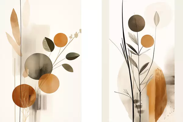 Poster Absztrakt festmény utánzat narancssárga és szürke körökkel, levelekkel és ágakkal, modern stílusban, akvarellhatással Nr d01009