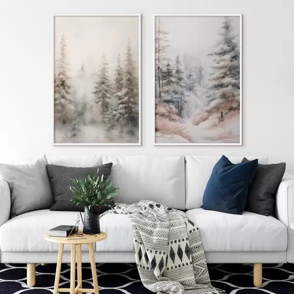Poster Hóval borított magas fenyőfák, ködös erdőben állva, lágy, tompa téli táj Nr d01011