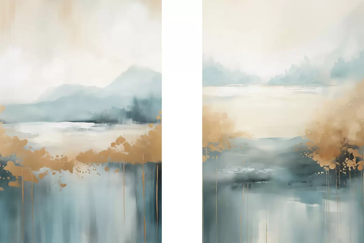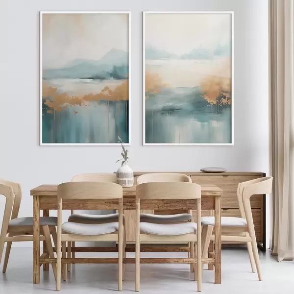 Poster Absztrakt táj hegyekkel és tóval, türkizkék és texturált sárga színekkel, lágy ecsetvonásokkal, minimalista műalkotás Nr d01012