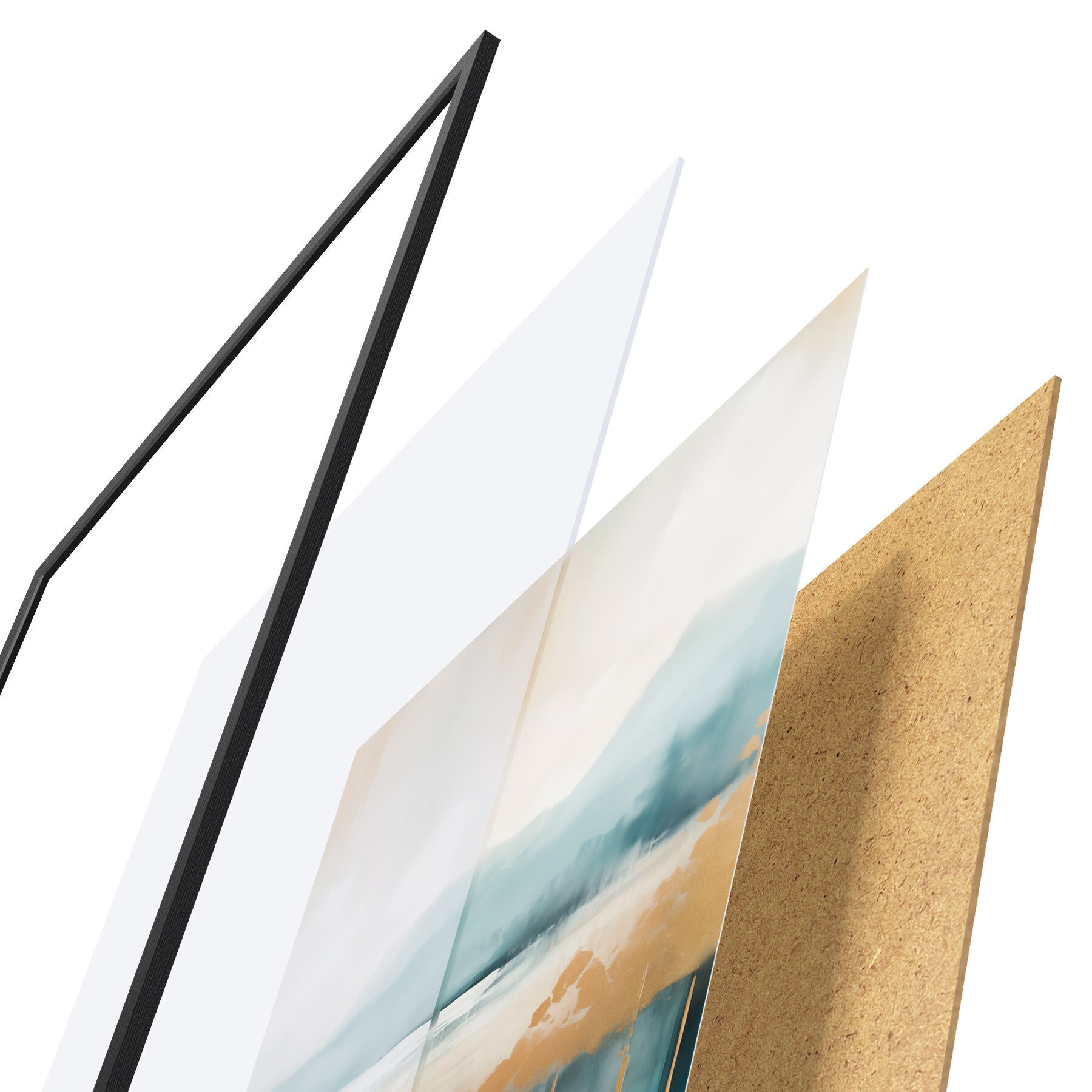 A poszter keretből, plexiből, nyomtatott képből és forgácslap hátlapból áll. A poszter a hátoldalon található rögzítőknek köszönhetően azonnal felakasztható a falra.