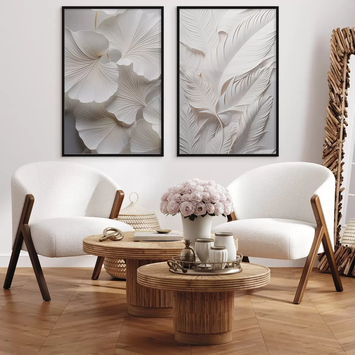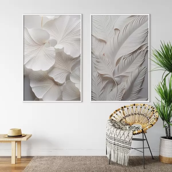 Poster Fehér ginkgo levelek és hosszú levelek bonyolult részletekkel, texturált és réteges hatást keltve, minimalista művészet Nr d01013