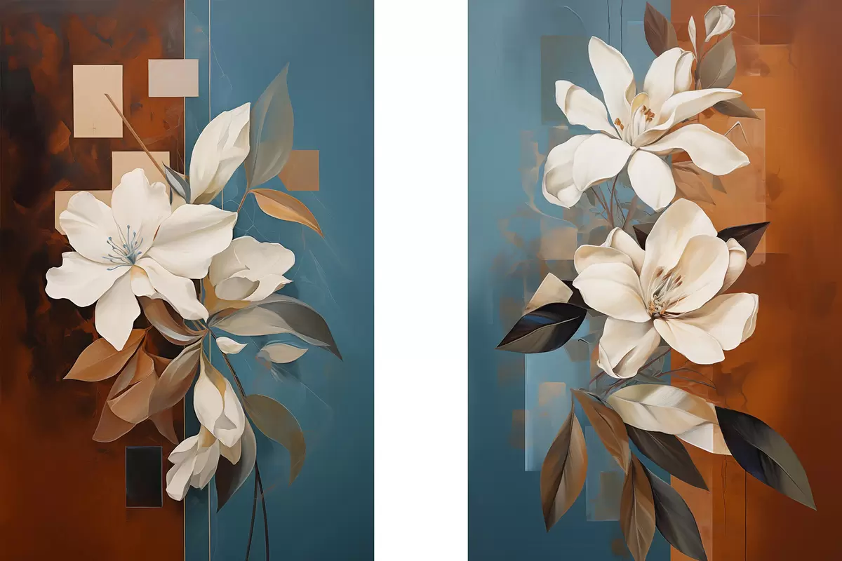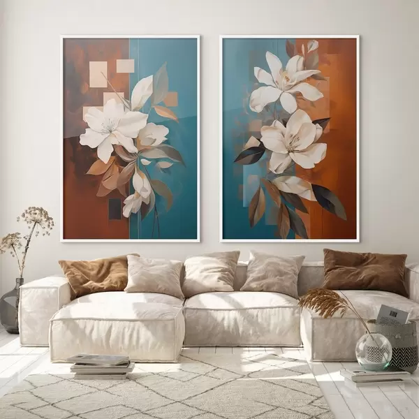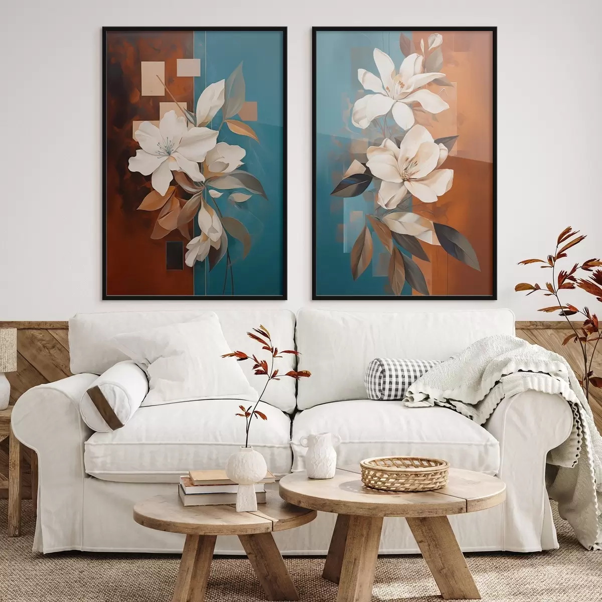 Plakát a sziklán Absztrakt fehér virágok és levelek barna és kék háttérrel, absztrakt formákkal, minimalista stílusban. d01015