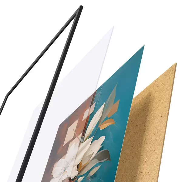 A poszter keretből, plexiből, nyomtatott képből és forgácslap hátlapból áll. A poszter a hátoldalon található rögzítőknek köszönhetően azonnal felakasztható a falra.