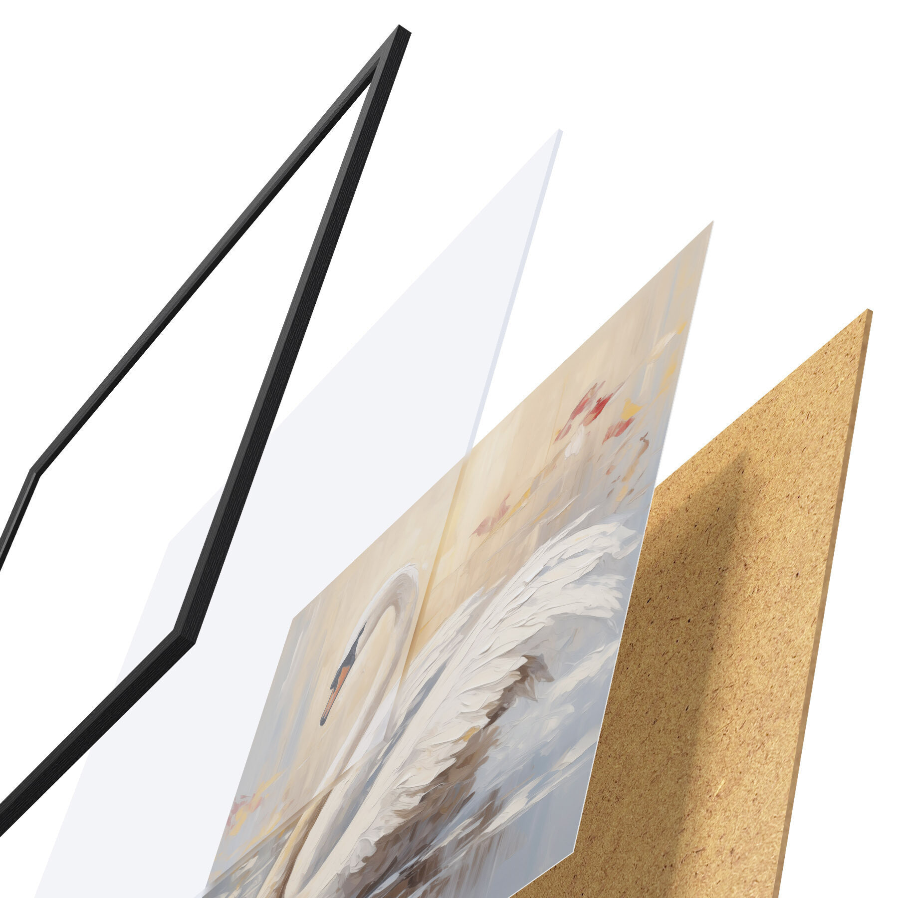A poszter keretből, plexiből, nyomtatott képből és forgácslap hátlapból áll. A poszter a hátoldalon található rögzítőknek köszönhetően azonnal felakasztható a falra.
