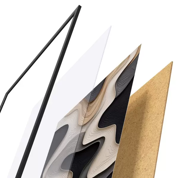 A poszter keretből, plexiből, nyomtatott képből és forgácslap hátlapból áll. A poszter a hátoldalon található rögzítőknek köszönhetően azonnal felakasztható a falra.