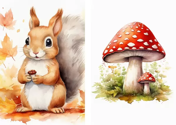 Poster Mókus és erdei gomba, légygomba, imitált akvarell Nr d01049