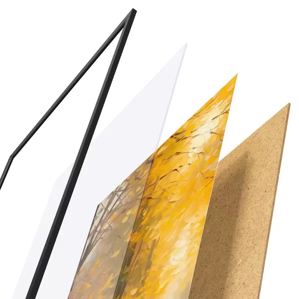 A poszter keretből, plexiből, nyomtatott képből és forgácslap hátlapból áll. A poszter a hátoldalon található rögzítőknek köszönhetően azonnal felakasztható a falra.