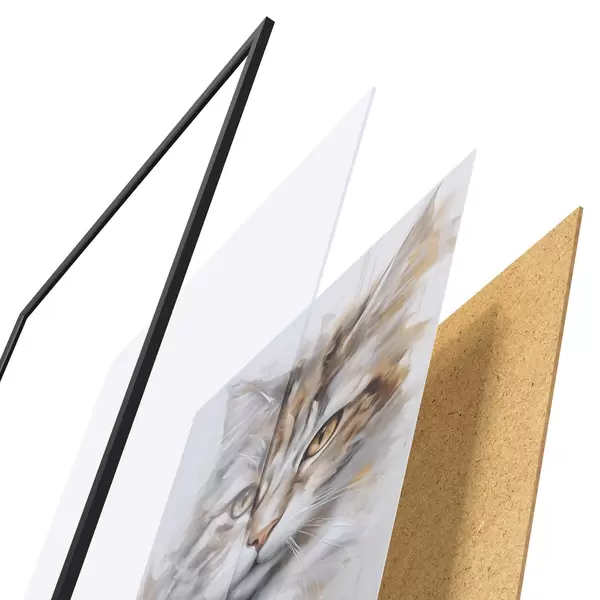 A poszter keretből, plexiből, nyomtatott képből és forgácslap hátlapból áll. A poszter a hátoldalon található rögzítőknek köszönhetően azonnal felakasztható a falra.
